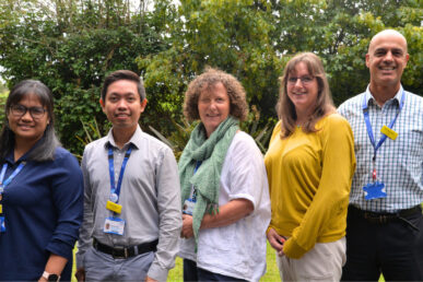 ![Three clinical colleagues sat together with a patient wearing sunglasses]()